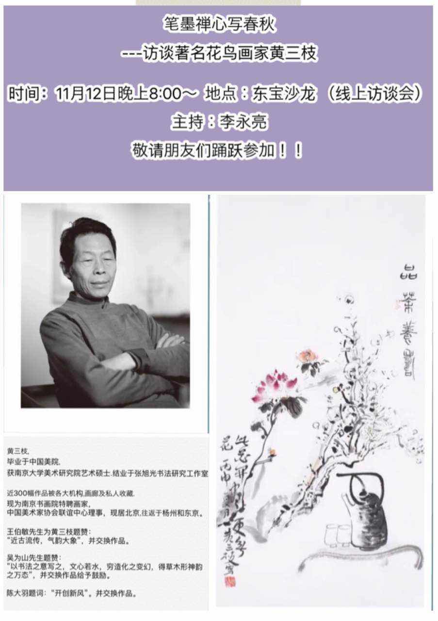 李永亮:各位朋友,晚上好!我们今天晚上的笔墨禅心写春秋---访谈著名花鸟画家黄三枝”,马上就要开始了。在访谈开始之前,我们欢迎杨永居先生代表东宝沙龙艺术委员会致辞,掌声欢迎!