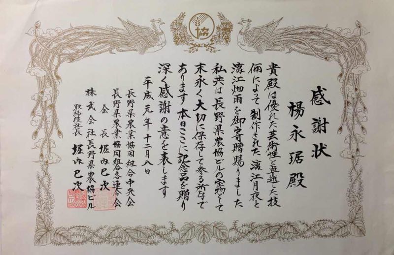 我是來日前在杭州与永井宏一先生认识的,那时我在杭州办画展,永井先生参观画展,购藏我一幅"達摩大师图",互相交换了名片,交谈中知道他是日本新瀉大和町的农民,任大和町议会议员,随议会研修团访问中国的。我初到日本时,人地两生,试着到永井先生家探访。永井先生一家都非常欢迎我,我亦喜欢他们的纯朴亲切的性情,当时我说不好日本语,只能用笔交谈,彼此亦能沟通,成为常联系的朋友。永井宏一先生很喜欢中国画,也真心支援我,希望我的艺术能有所发展,取得成就!我初来日本生活遇到困難,他常常约我画画,預付画款给我,先后画了50米长巻桂林山水图,画四屏花鸟障壁画。长年以來,在我的个展上购藏几十幅作品,改造自己的库房设立"杨永琚美术馆"。善光寺障壁画发表会那天,他驾车到现场,看到我画的障壁画,露出滿意的微笑。支援我的日本友人还有很多,我都一一記在心里,每年年底给他们寄去"岁暮",表示对他们的感謝!