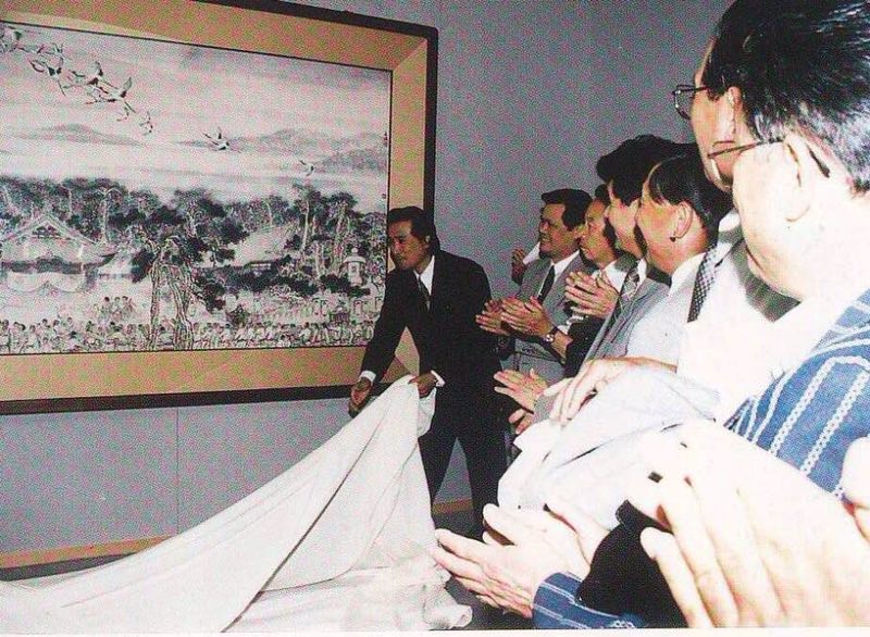 市长清水也为杨永琚的诚意所感动,他邀请杨永居为未来即将落成的政府新大楼创作巨幅“桂林胜景”,在落成庆典的时候,听说有很多日本市民为之倾倒,他们为了要在画境中寻找实景和真情,大约有16批日本访中团来到了桂林。提到清水市长,杨先生一定有许多话要说吧!