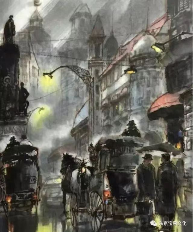 我创作欧洲这个题材的过程中,我发现欧洲是非常有魅力的。特别是白天。他这个下雨之前突然天气就发黑了,黑的一瞬间就下雨,下雨也就下十分钟左右就停了。绅士们的男人穿着风衣戴着帽子,女人们都躲到这个店里面去了,下雨过程中店里面的那种灯光映照到石板地的地面,感觉到这种灯光灿烂的一种迷茫,或是像虚幻的一个世界。