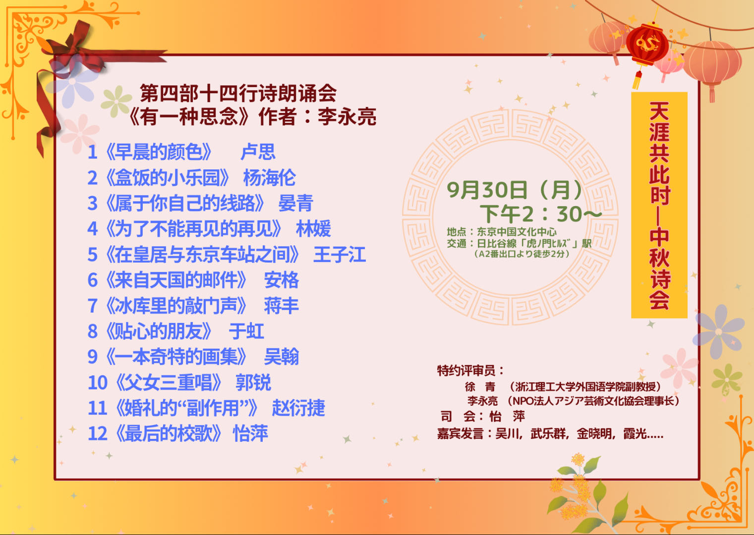 李永亮上世纪八十年代末来日之前在上海戏剧学院任教,是位通过戏剧等舞台演出致力于中日友好交流的实践家。由于新冠肺炎的流行,导致舞台演出无法正常举行,李永亮想法设法通过ZOOM开辟出一条深度互动的沉浸式表演新路子——十四行诗诵读鉴赏会。有道是,“塞翁失马焉知非福”,在这期间李老师创作的十四行诗,也是好评如潮,甚至于还吸引了远在大洋彼岸的加拿大等国的诗歌爱好者们的围观。