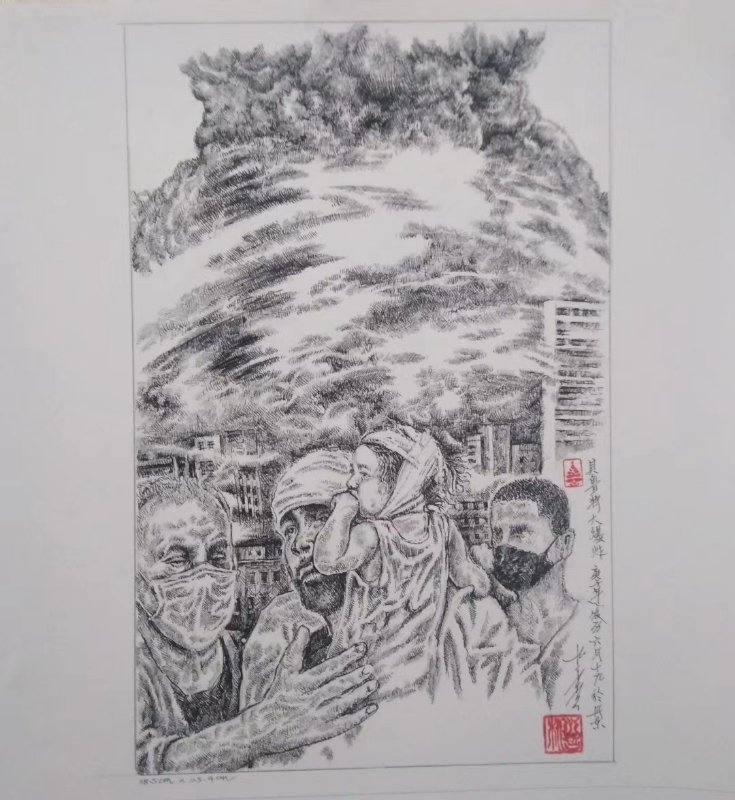 世界新闻黎巴嫩贝鲁特港口大爆炸题材钢笔(黑白)画真迹原创精品