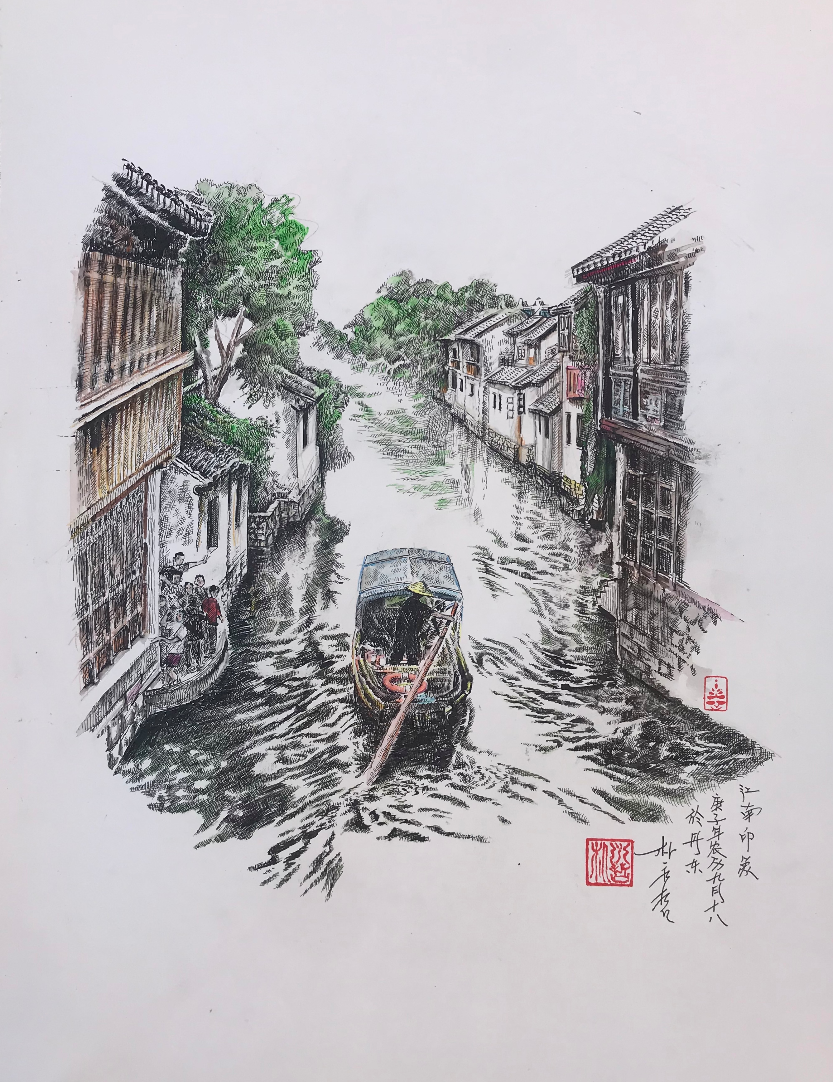 中国江南风情题材钢笔(淡彩)画真迹原创精品。