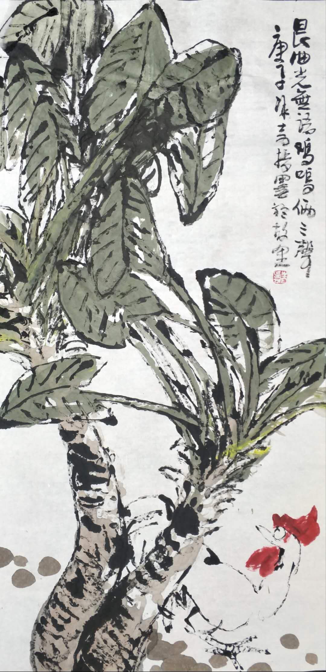 画中落款为李冰奇先生所题:一晚风吹雨,尔吾共洗尘。永琚画鸡,冰奇指墨補成并题。
