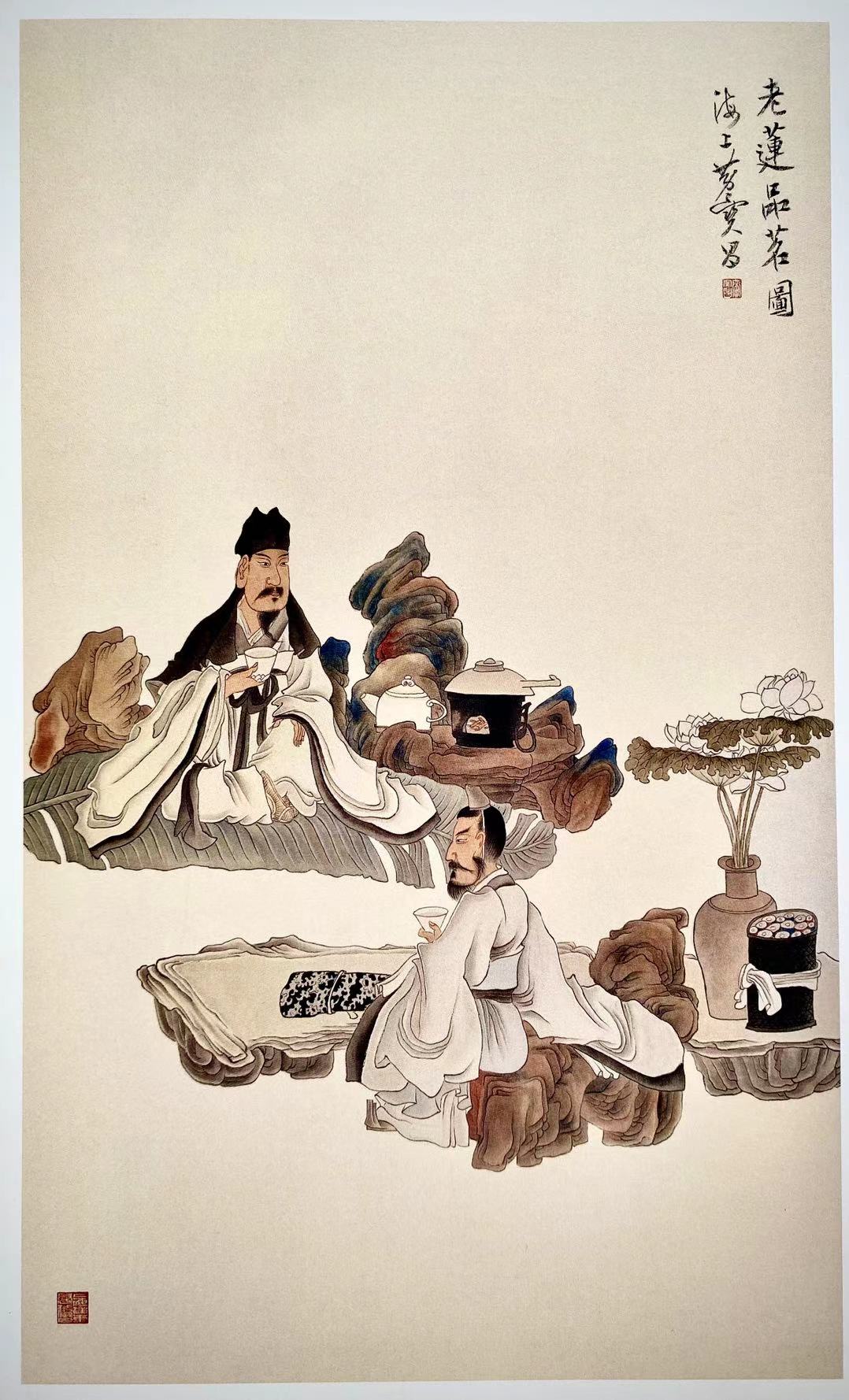 仿陈老莲"品茗圖",绢本设色,90x43公分。