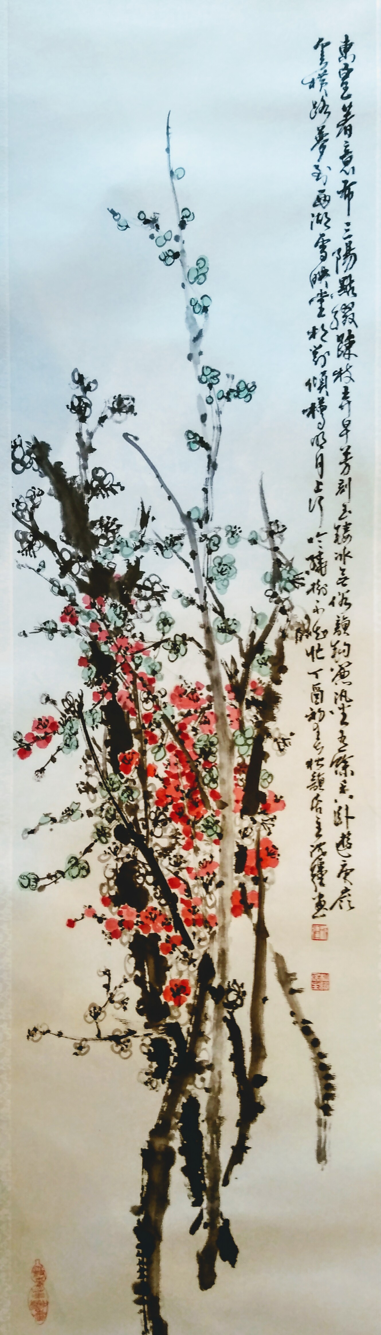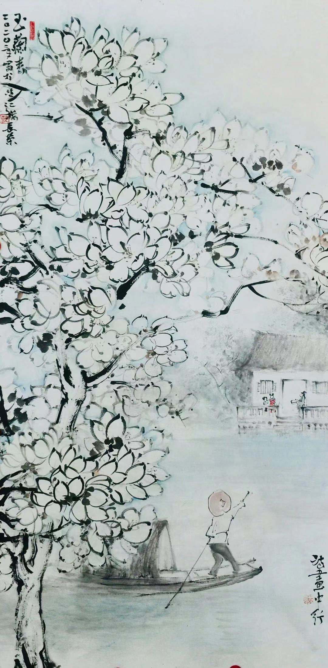 枝干笔墨苍劲有力,,花瓣争其绽放,人物动态生动 @詩書畫中行范長荣