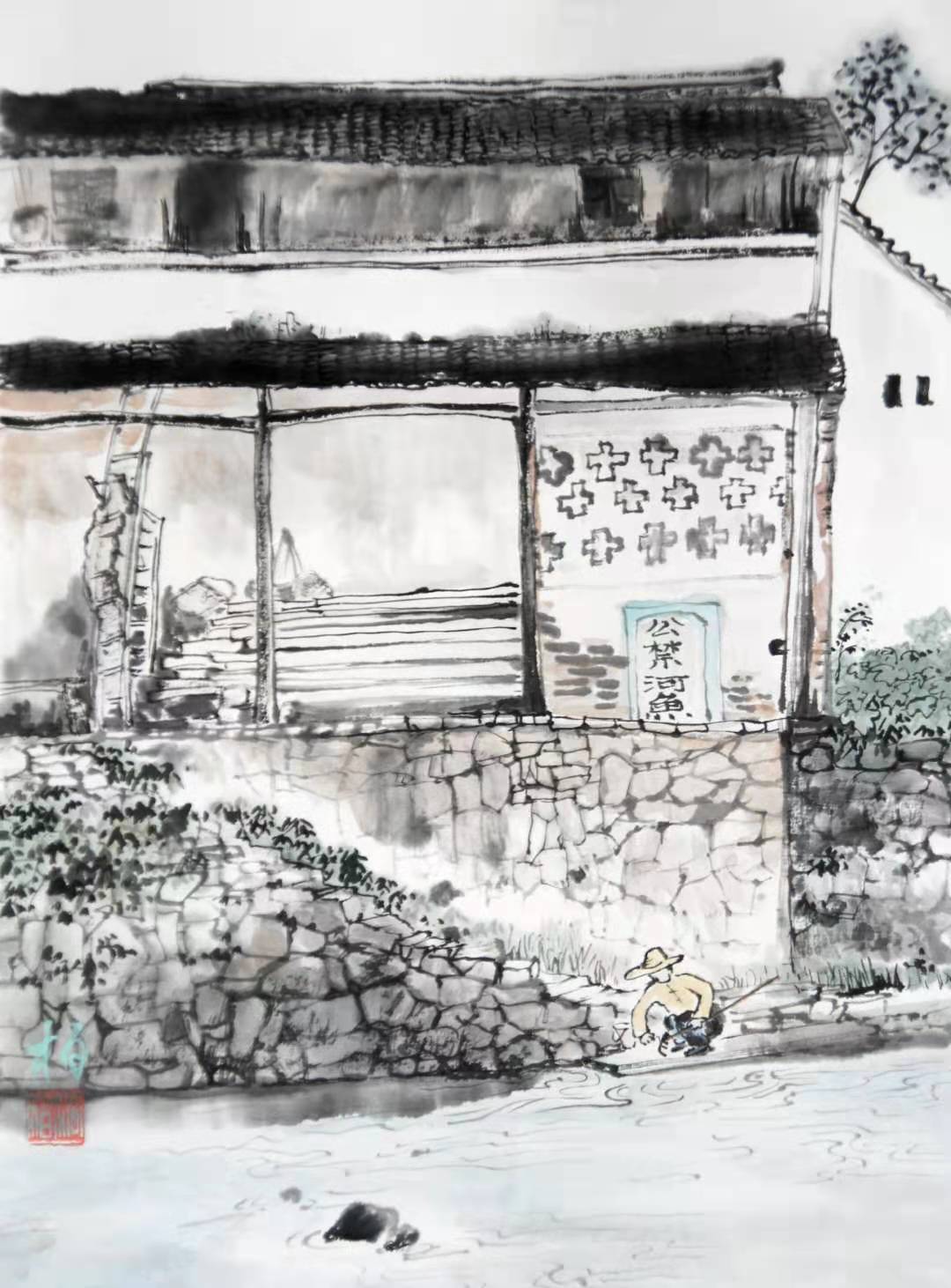 安徽写生小品(半纸尺寸),墙上有公禁河鱼字样。