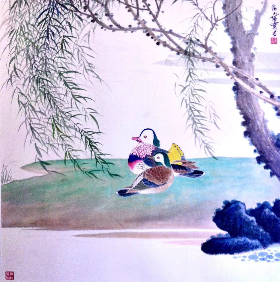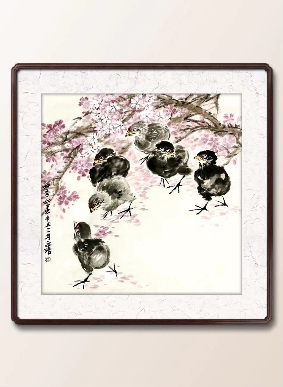 @杨永居 ,四季如春作品,构图讲究,设色明亮淡雅,春风微漾,雏鸡闲散—片田园春光