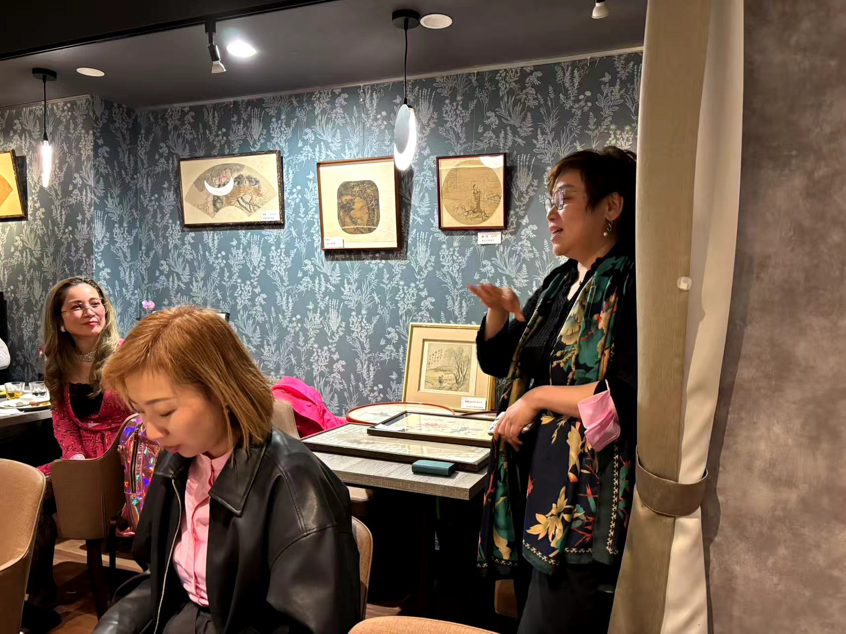 开幕式由朗诵演员林媛女士主持,她说:表参道是日本东京最富有文化气息的区域,在这样的一家代表中国食文化的素食店里,举办中国清末民初的绘画名作展,是一个有意义的创举,是企业与艺术的珠联璧合。