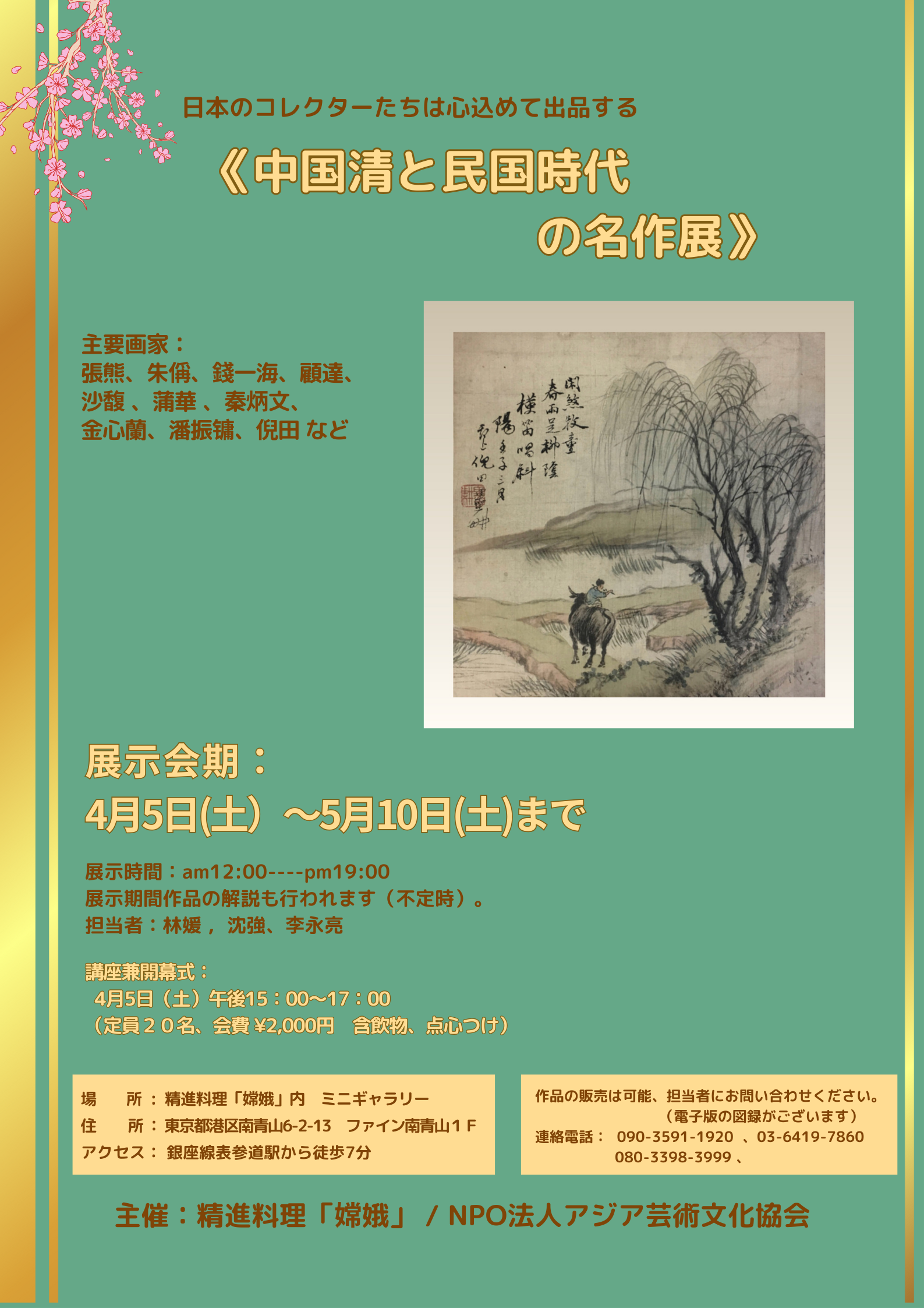 “中国清、民国时代的名作展”,展期是4月5日到5月10日,请对素食料理和名人字画感兴趣的朋友相互转告,踊跃参加。