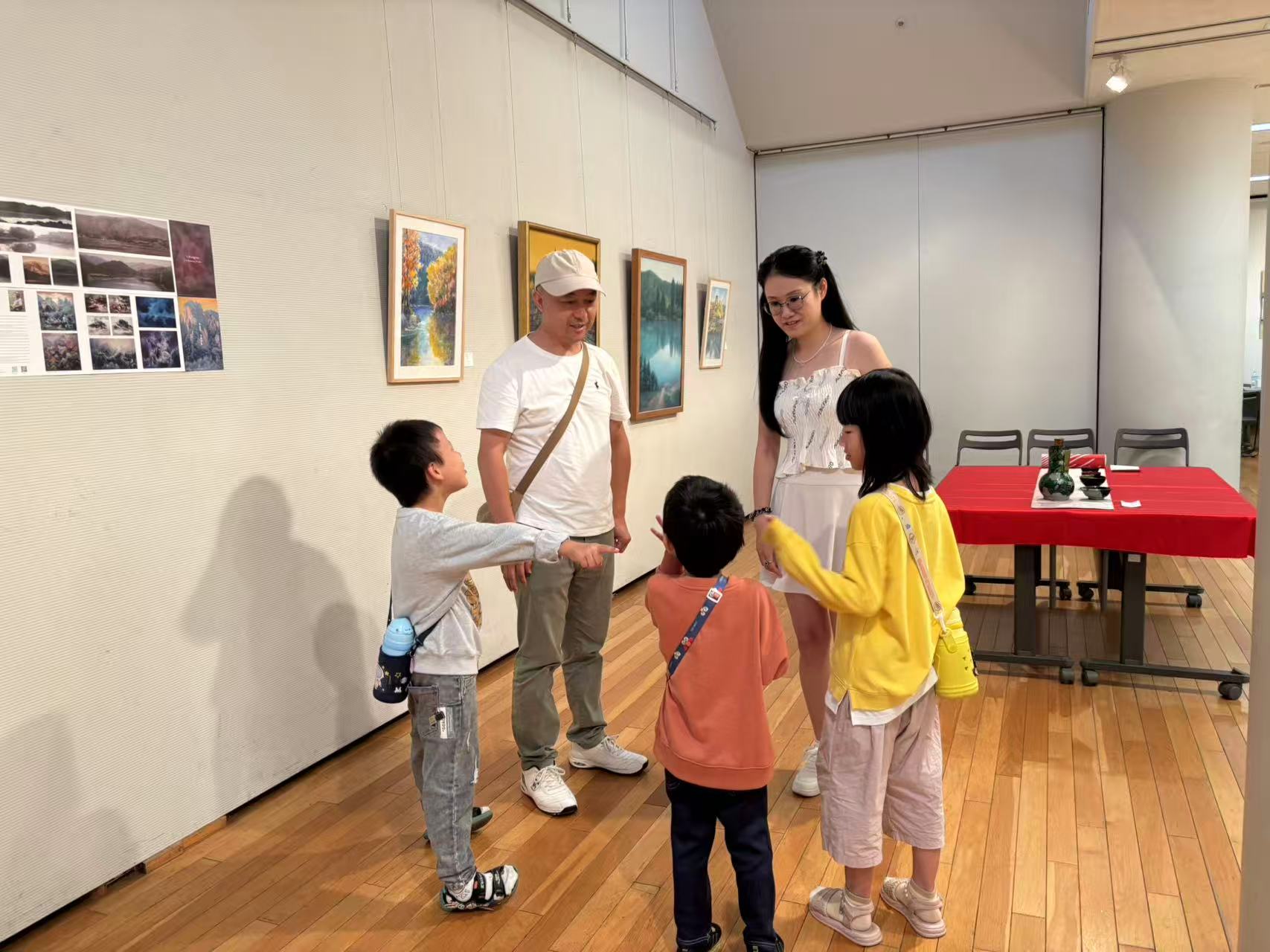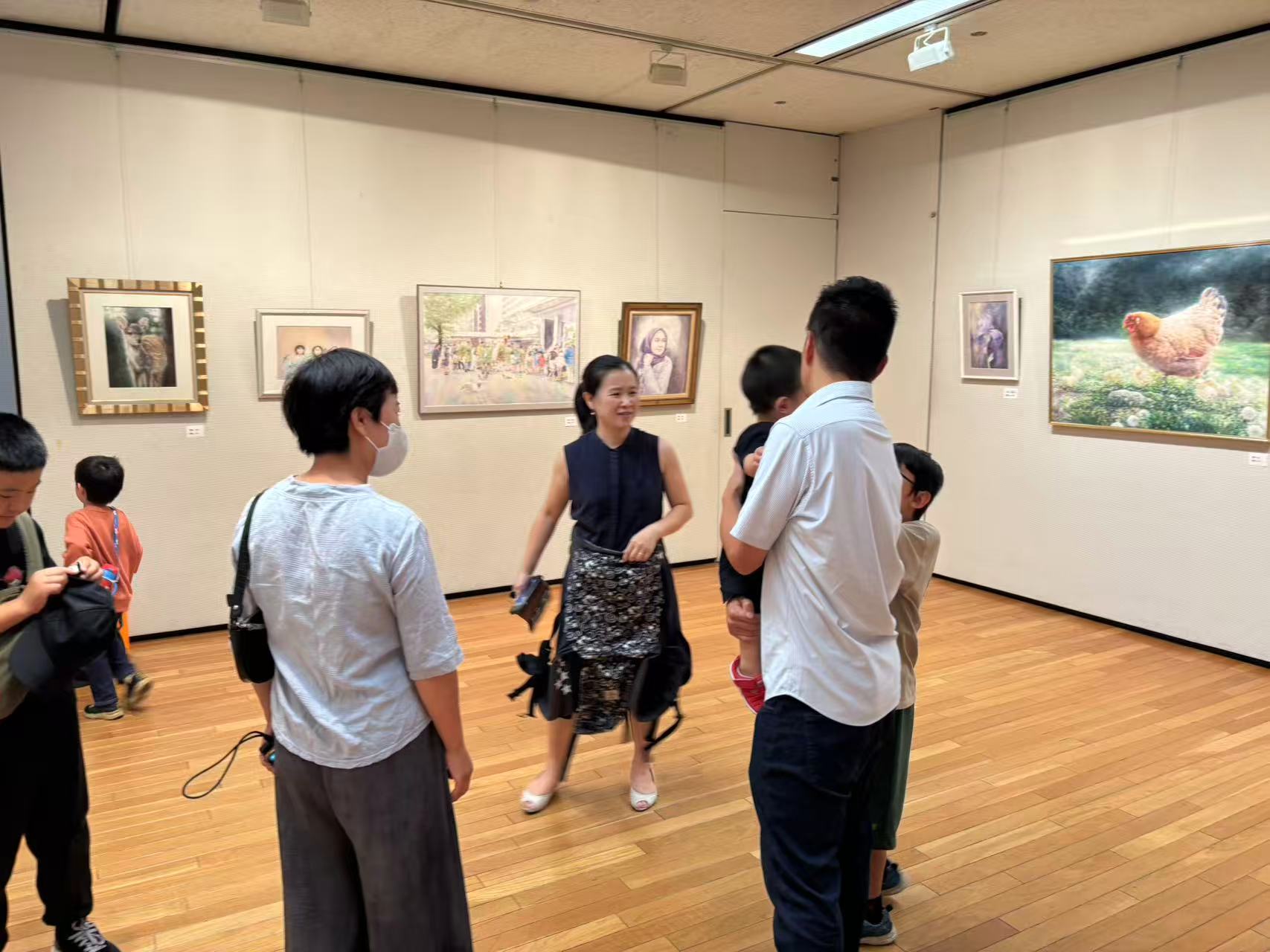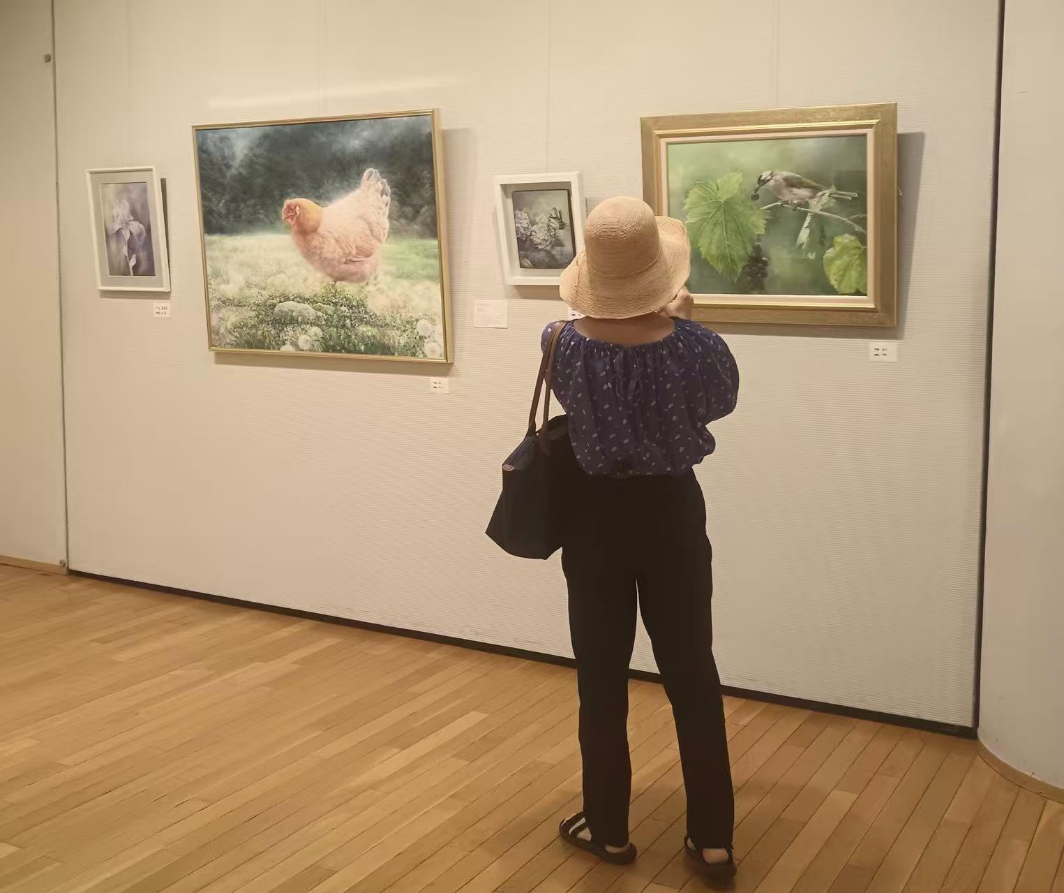 展厅的另一个墙角处,大小间隔的画框挂满了两面白墙,细细地看过去。仿佛看见了晨光里慢慢靠近的小鹿,它也正好奇地打量着我;仿佛听见了日本夏日祭里的欢声笑语,快乐的气息映出一地的五彩缤纷;仿佛感受到了蝴蝶起身离开紫阳花,花儿微微弹跳的一瞬间。还有那幅母鸡领着鸡宝宝在草地里觅食的画面,是那样温馨,饱满蓬松的母鸡,闲庭信步般从容又有母爱,好是美好!郑训兴先生的油画和水彩画都画得很唯美,果然艺术家总有一双发现美的眼睛,身边不经意间的一瞥都能成为他笔下的灵魂再现。