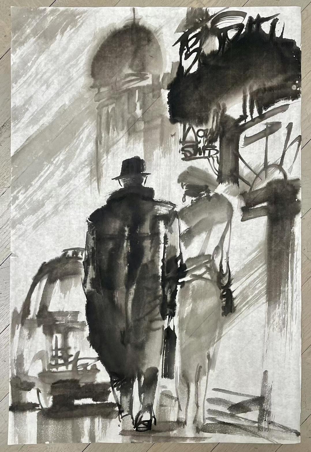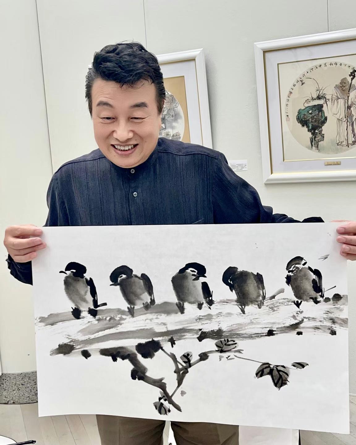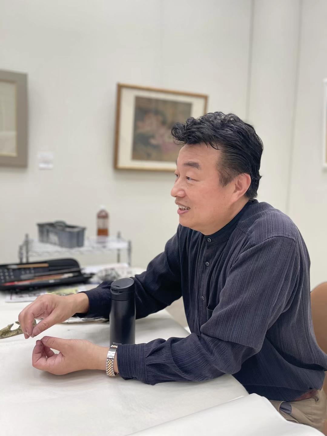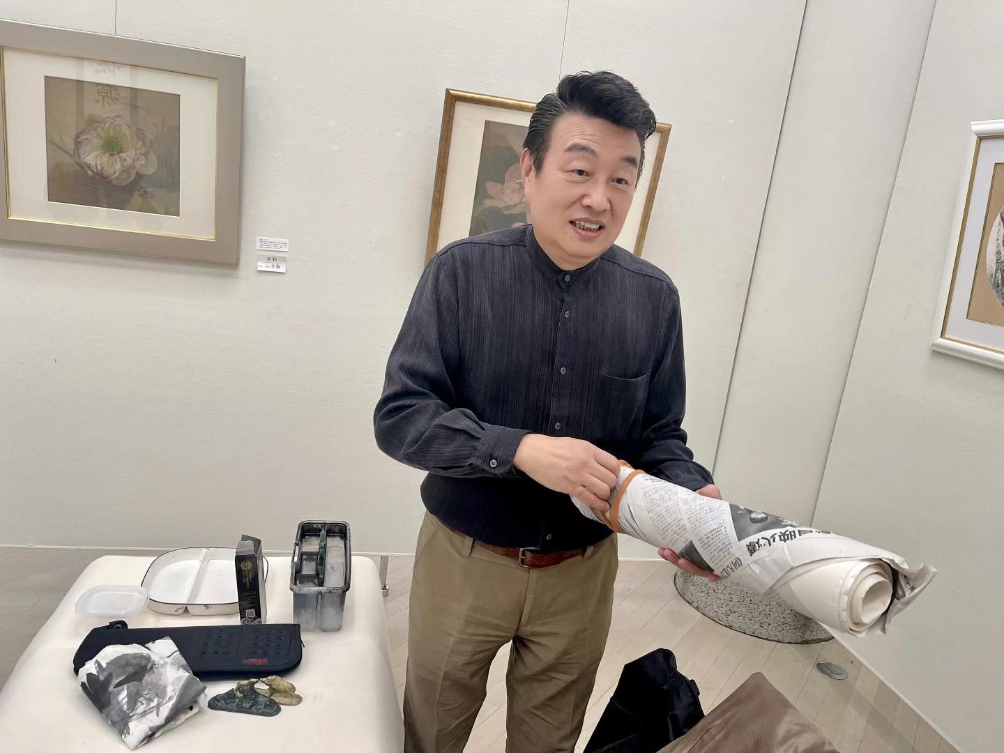 【日中画家书家美术展】的第五天,周六的东京一大早就下着雨,远处出现一个身背大包,精神抖擞,打着伞的熟悉身影,他就是在百忙之中抽出时间,为展会做现场表演的著名画家王子江老师。