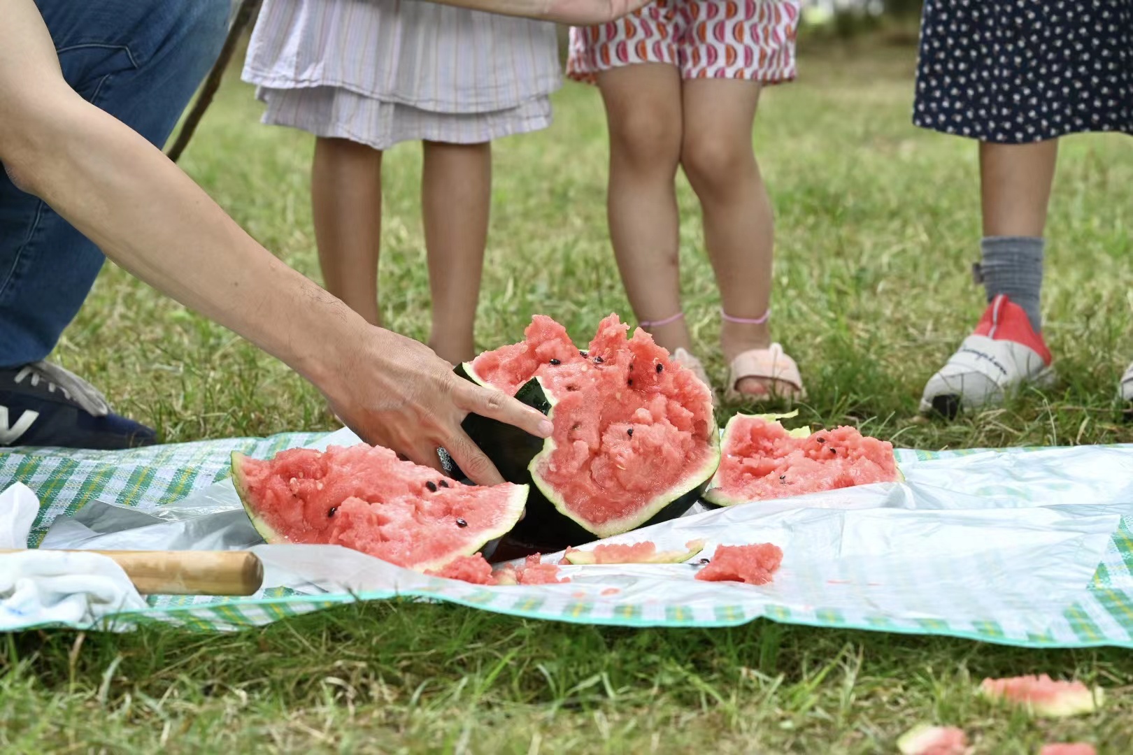 第三次是读书会的小伙伴们带家属在公园里聚会。我买了一个西瓜带孩子们玩蒙眼睛打西瓜的游戏。草地上铺了塑料垫,谁能把西瓜打出裂痕就是胜利。顺着裂痕把西瓜掰成形状不一的大小块,我和小可爱们“抢着”吃西瓜的快乐是属于2022年夏天的美好回忆。读书会的姐妹里有两位当时怀着二宝,虽然与小可爱们的集体相见仅仅那么一次,这几年朋友圈里却常能看到小可爱们的成长,好像自己就在身边参与着云养娃。最重要的是与几位“灵魂搭子”见面的读书会早已成为我每个月的最美期待。
