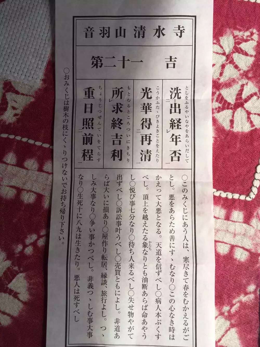想想五年前,我求到了吉签,可也并非事事顺风顺水,人心的难测与卑鄙险恶皆悉数一一历尽。而我此次求的签虽都不吉利,但到目前为止却是一切安好,云开月明。我后悔的反而是因自己所谓一心求好的执念,而在清水寺上演的,不断进行押宝式自我欺骗的“欠火候”的一幕。