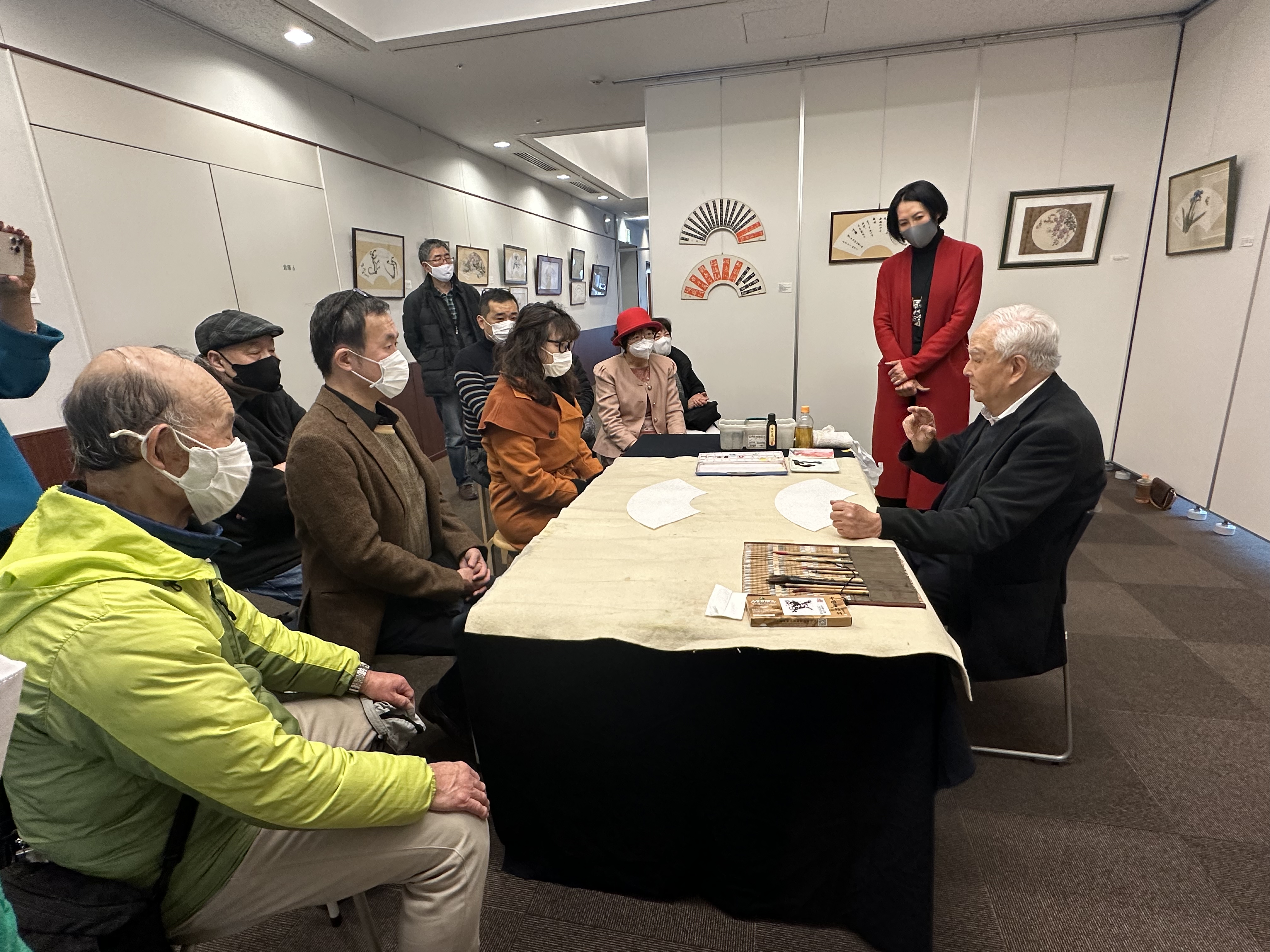 今天是东京入冬以来最为寒冷的一天,但在扇面书画的世界里,却充满了温馨的暖意。这是因为他来了,他是一位老者,更是一位贤者;他是一位艺术的高超者,更是一位正能量的传播者。扇面书画展的第四天,我们迎来了著名戏曲人物画家李文培先生。