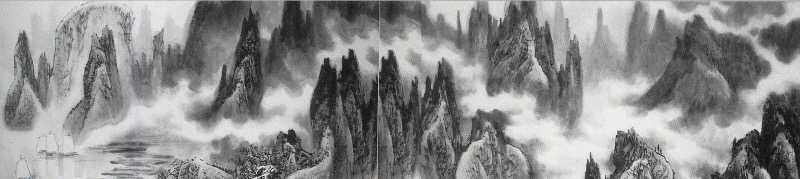 新泻产的米是日本最好的米,产的西瓜是日本最清甜的西瓜,每年永井都会给我寄米寄西瓜,鼓励我多创作好作品,还鼓动当地政府为我举办个人画展,带头购藏我的作品,之后先生约我为他绘制大幅障壁图画,绘制长卷《漓江胜境图》50余米,永井所在的大和町是日本最冷的地方之一,冬季积雪厚达一米有余,乡亲们农闲休业在家,围炉清谈时,永井总是拿出《漓江胜境图》展卷逐段欣赏,为清冷的农家增添乐趣。