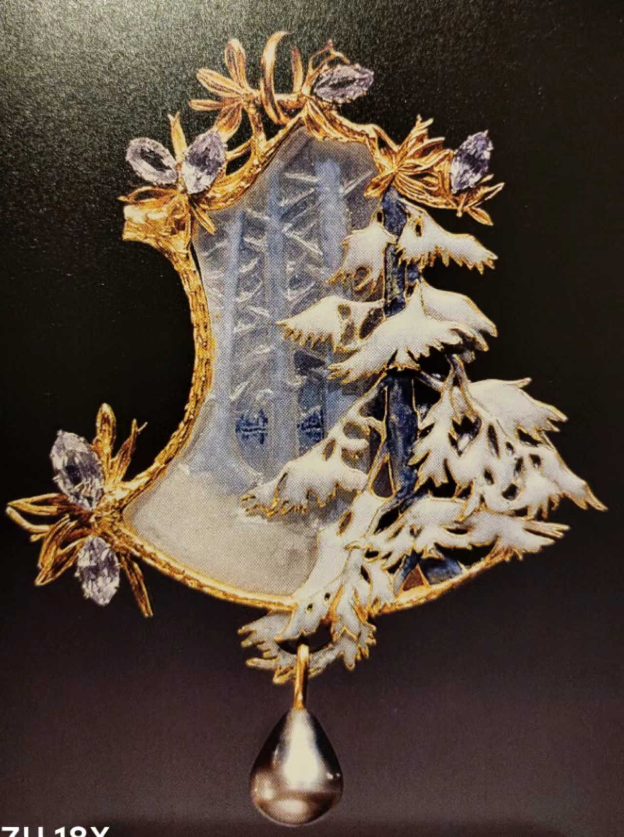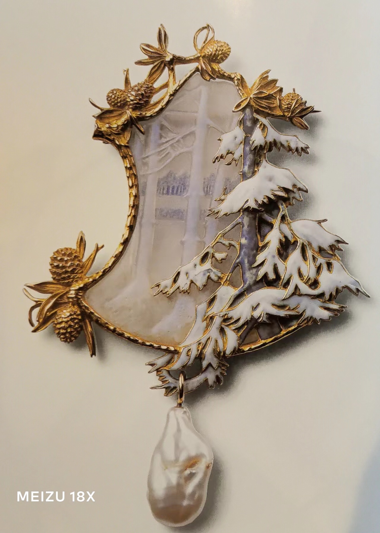 再细看我们会发现黄金上烙了珐琅,拉里克以此来表现因雪的重压使针叶树的树枝下垂的感觉。又使用薄板做成浮雕状,来展现湖的周围长满的树木,以及落叶的景色。吊坠的边框是金制的,整体被加工成针叶树树叶的形状,并缀有6粒松球状的果实(图4)。有的乍一看像钻石,其实是切割成马克萨斯形的透明玻璃(图5)。灰色珍珠暗淡地闪着光,令人联想起冬日灰色的天空。