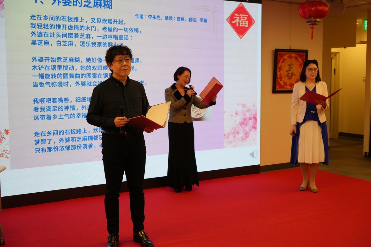身在故土以外,大家还能在本土文化基础上“玩”出一种精神的追求和满足,这对写诗、朗诵和聆听的人来说,何尝不是一种高雅的体验呢。此时,我想起了日華作家协会会长弓也直先生,在他精彩的开场贺词里所提到的:“诗歌以最少的文字,承载着最丰富的情感与意象;诗歌的重要性,在于让人类保持对语言的敬畏,对情感的敏感,对世界的想象力;如果没有诗歌语言会变得干燥,文化会失去灵魂;好诗,永远有滋养人类心灵的作用。”是啊,对我这个喜欢听诗朗诵的人来说,岂不是天随我愿,是最大的幸福和满足?这实在是太美好了。