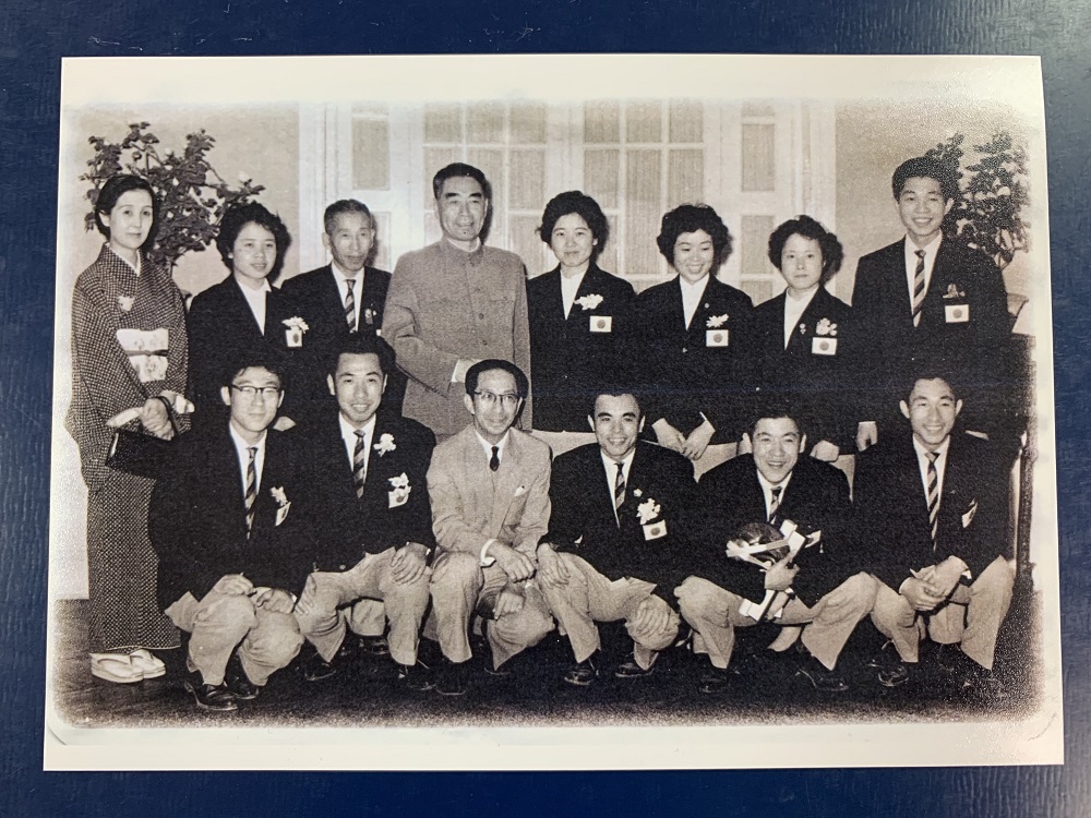 为日中友好,在我的球馆中就挂着一张1961年周恩来总理在北京接见日本乒乓球代表团的集体合影照片,松崎君代老师就站在周恩来总理的旁边。