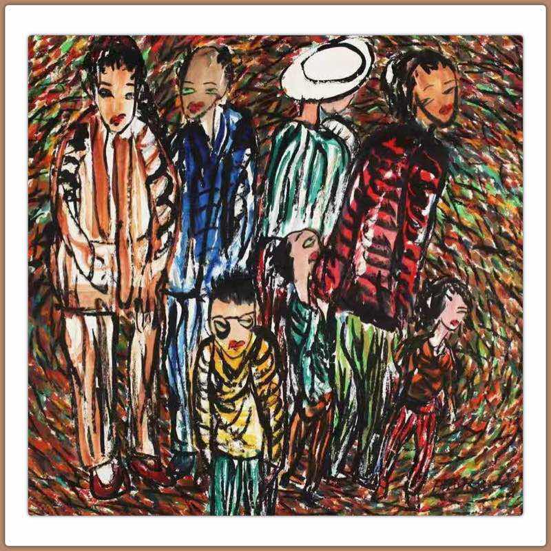 段落短评:这幅‘路人’绘画的主要趋势是丰富的造型手段,即空间、色彩与线的运用。从具象到抽象,人物表情虽然整体冷漠,却已注重和谐的美感与细微人性的关注,黄衣中年面无表情低头凝视孩子,他目光呆滞。秃头的兰色衣襟传来不安眼神,卑微幽怨的红色少妇正拖着两个不愿离开,还没玩尽兴的孩子,一幅怕被嫌弃急于离开的样子。这一切的点缀和布景都好像是为了衬托这个优雅半遮脸的白纱帽绿霓裳的芳华少女,她的高贵冷艳与其它的路上并立在一起形成了鲜明的对照,不得不说作者在绘画人物中“画言外”时的别具匠心。象外之致,韵外之味。