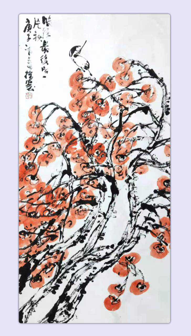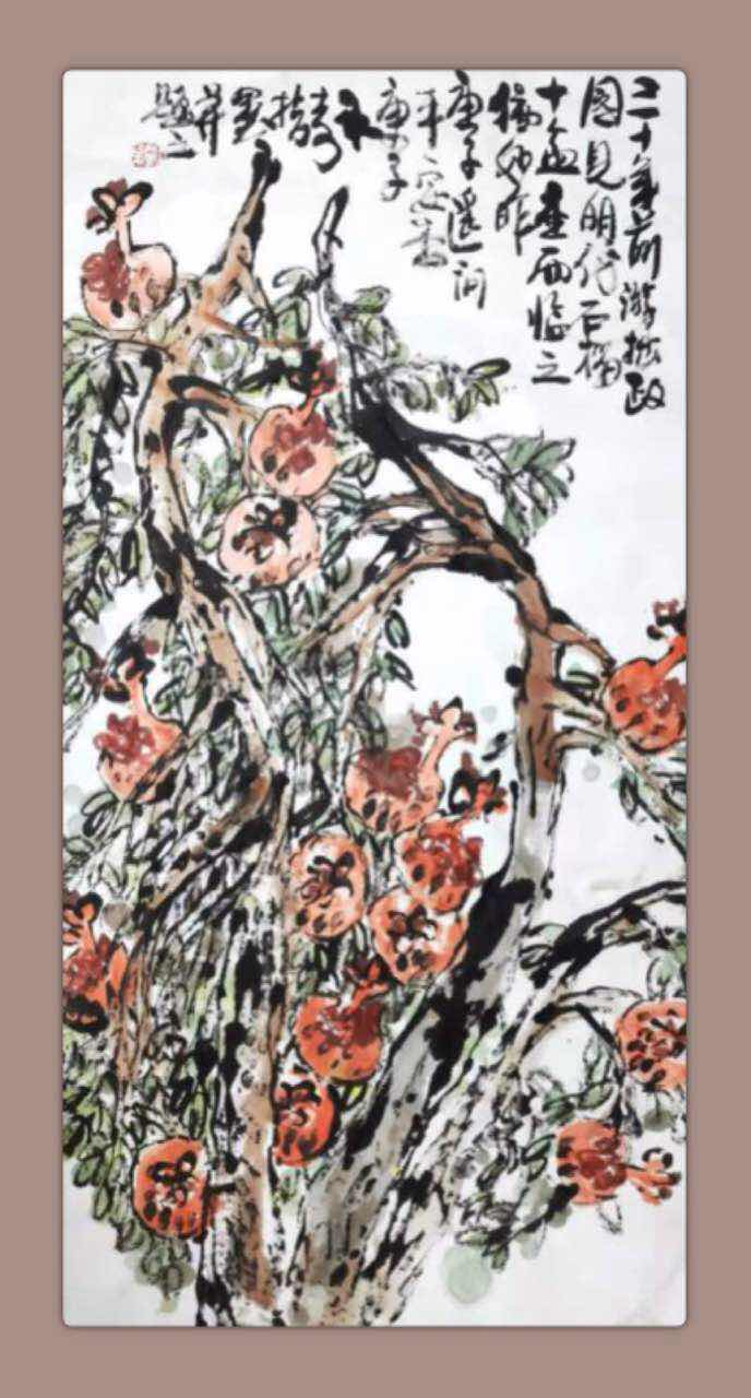 此幅石榴图的構圖、用色确实精彩!以我画画的经验,难以为之的是画出了石榴的生气,表现树干的两根主线抱心合力往上走势,以小树枝破之,参差互让又气息相关,形成向上的力量,我们看到的石榴枝是有生命的,用手去碰会感到有弹力,硬挺坚实,冰奇先生以深厚的指画功力,表现出浑拙苍茫的石榴树,感动了观众。
