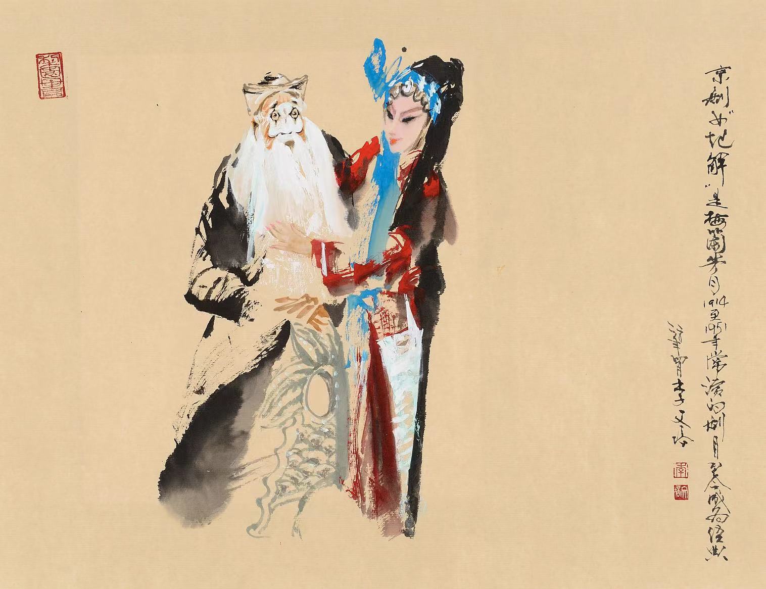 此画为崇公道与苏三在押解太原途中消除误会之情景。虽是悲剧,但却有幽默的成分。笔墨洒脱,繁简搭配,妙趣横生。