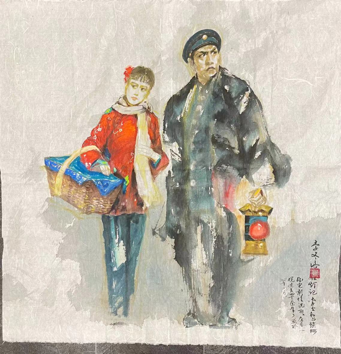 表现的是铁路工人李玉和李铁梅的这种不是父女胜似父女的亲情。画面中有红灯,和小卖的篮子,这是一个时代的写照。