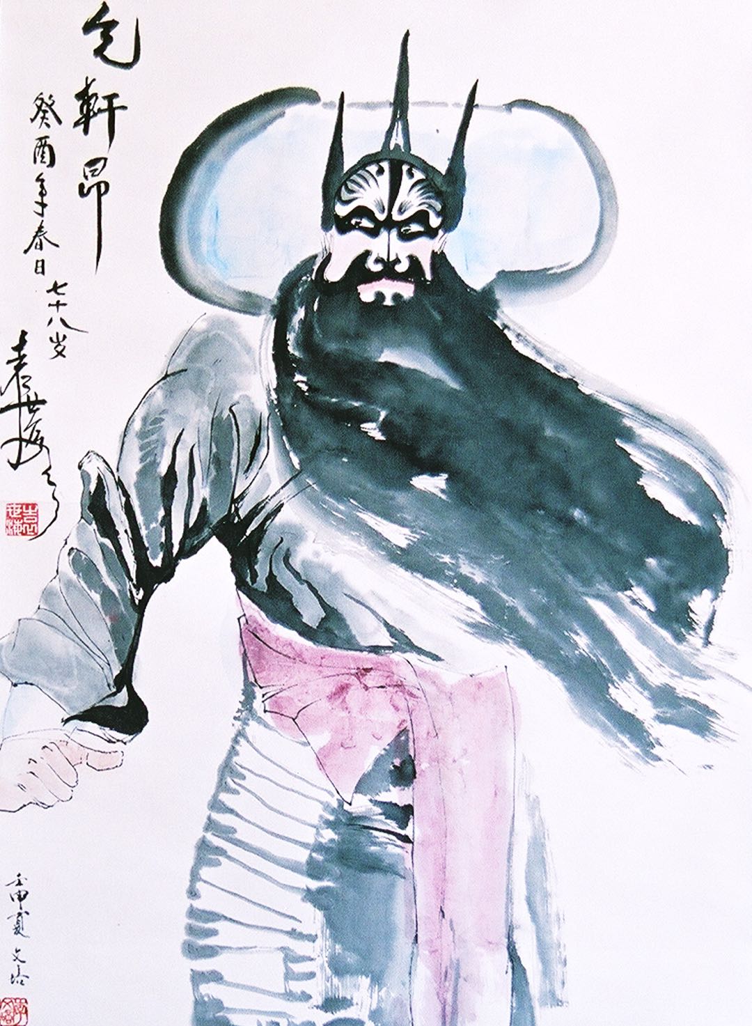 此画作于1988年,京剧大师袁世海先生欣然命笔“气轩昂”三个字。当年先生七十八岁,“海”字写得扬波状,极有趣味。画家这幅画成为袁老亲笔题字的绝品。