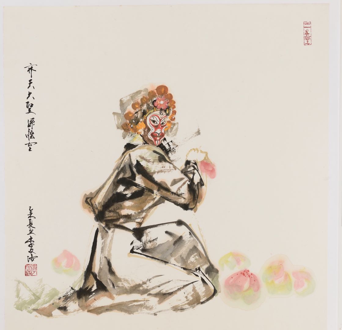 京剧中黄色是皇帝专用,因为孙悟空曾经封自己为“齐天大圣”,和玉皇位置一样,所以也身穿黄色。孙悟空的脸谱是一个倒立的红桃儿,红脸缘外边涂金色或银色。画家简约淡雅的笔触就勾勒出一个美猴王的形象,动态十足。