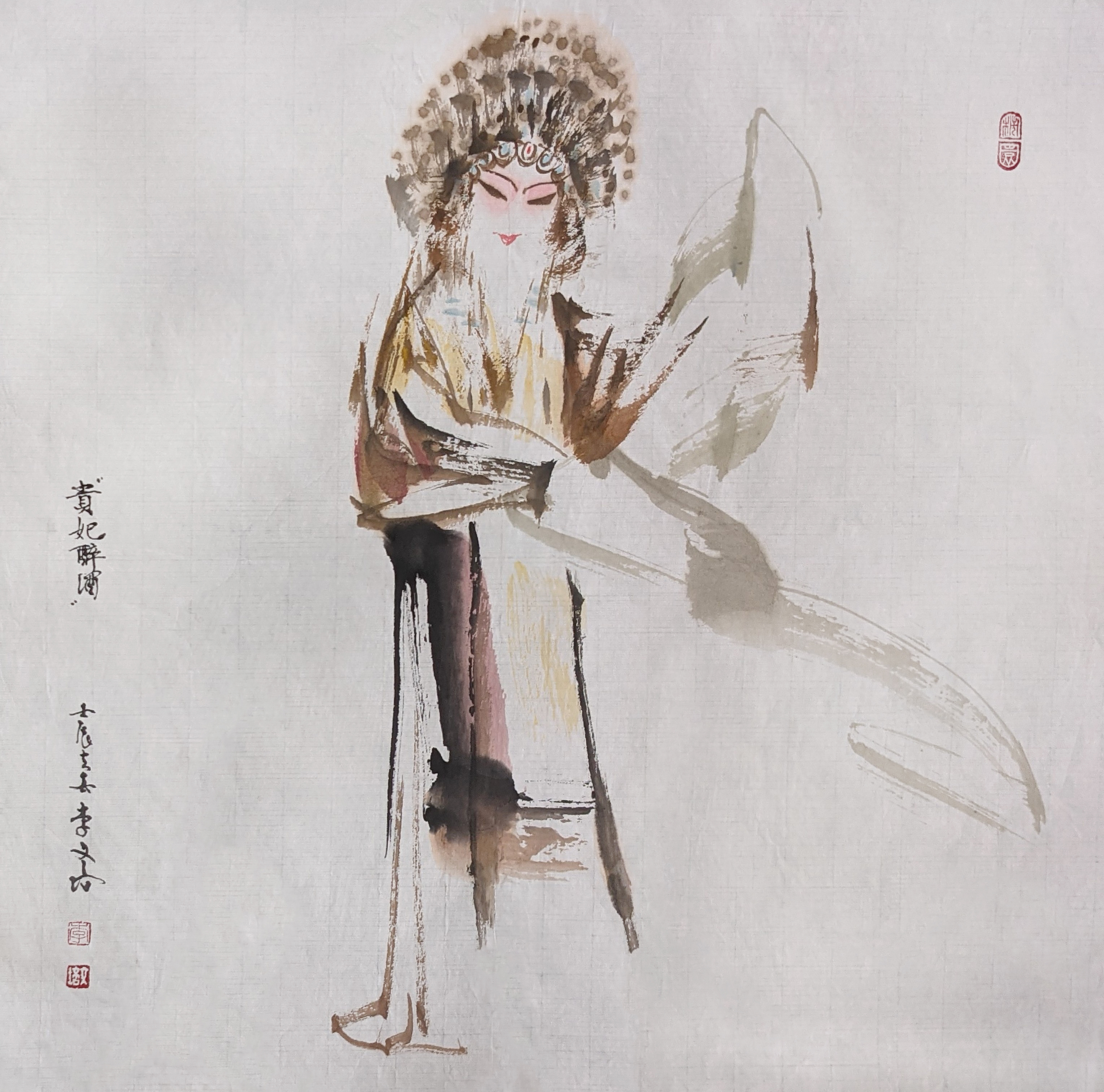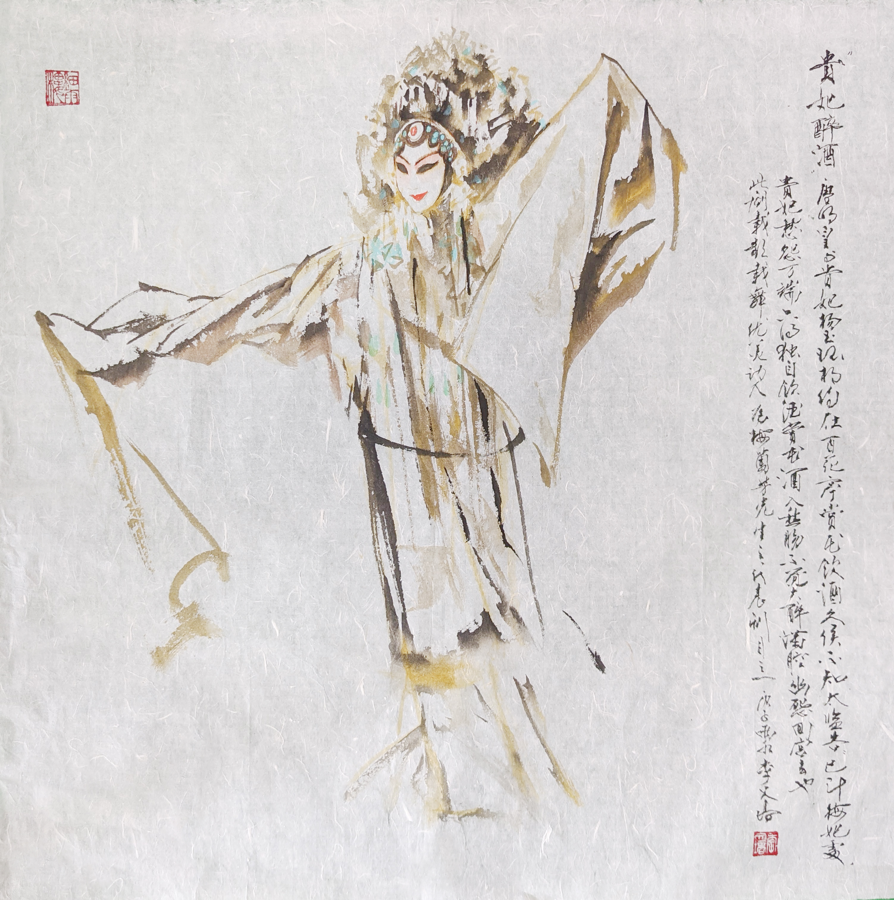 32 “贵妃醉酒”唐明皇与贵妃杨玉环相约在百花亭赏花饮酒,久侯不至,太监告:已到梅妃处,贵妃愁怨万端,只得独自饮酒赏花,酒入愁肠,不觉大醉,满腔幽怨,回宫去也。此剧载歌载舞,优美动人。为梅兰芳先生之代表剧目之一。庚子雨水 李文培。70cmX70cm