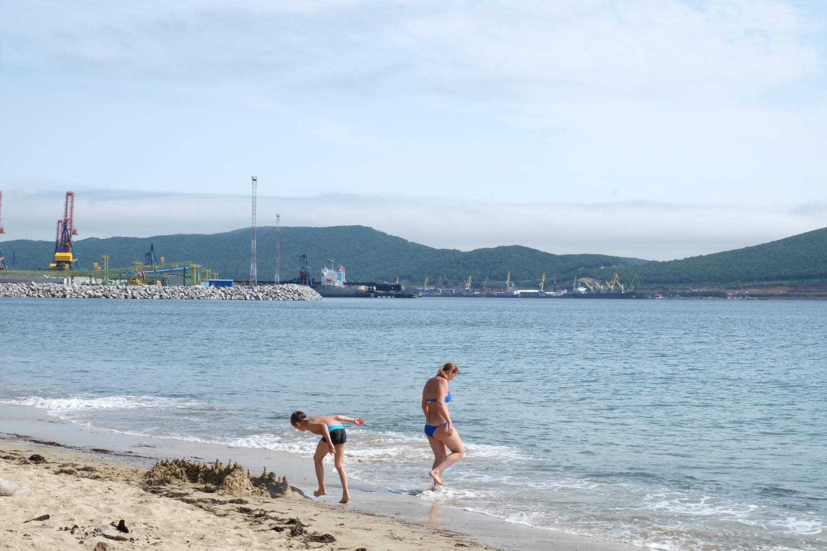 房间里真是太乱了。她让我看她二十几年来所获得的荣誉。都挂在了正面那面墙上,奖状,奖旗,奖章,照片。有中国方面颁发的也有俄文和日本文字的。地上靠墙立着一排镜框,是她参加各种游泳活动的纪念照片。一张塌陷的布面沙发上也摆满杂七杂八的书或报纸。晚上也许就睡在上面。左面靠墙有一个做工粗糙的玻璃柜。最下面的玻璃打碎了两块。黑糊糊的地毯上扔满了东西,有书有照片,有一只拖鞋,还有毛巾和剪刀及一把勺子。我看到阳台上的水泥板暴露着锈钢筋,水泥脱落几处。大概不敢踩上去。说不定哪天风大,就会掉落在下层的阳台上。达西亚给我找出两本有点儿厚度的宣传画册——《NAKHODKA》(纳霍德卡)两本厚薄不一。她翻开《NAKHODKA》找出弗兰格里的那页,照片拍得非常漂亮,海面上飘着蓝色的薄雾遮着远处的“东方港”。她一边翻着画页一边快速地讲解。突然她自己笑起来,是感到自己好笑的那种笑法。我听懂她说出的单词里有“不懂”“不明白”;我想她一定在说:“喂呀呀,我像个傻瓜一样不停地说着俄语,我知道说了你也听不懂,可怎么总是说个没完呢!”还拍了一下自己的脑门儿,笑着。接着还是唠叨着俄语。