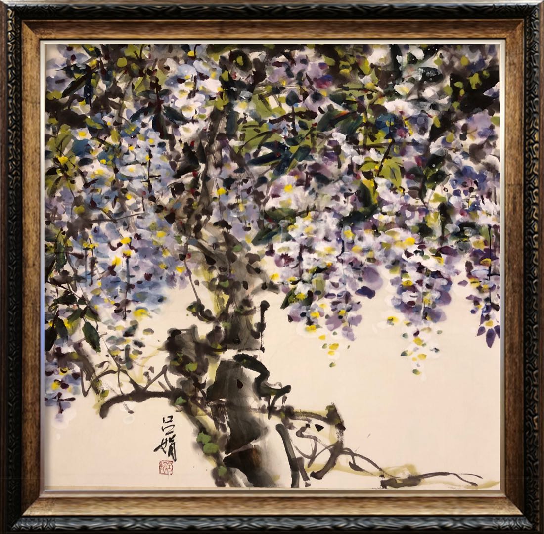 所以,当我看到吕娟《烂漫•紫藤》创作系列时,内心受到了某种信号的触动。当然我的这种触动绝对不是基于人们常说的什么枫丹白露画风的风景画,也不是历史前卫主义和抽象表现主义的概念指标。吕娟的花鸟画正好回避了一般性的写生式的创作倾向,什么具象与抽象、再现与表现、写实与写意等创作风格指派。虽然她的创作依然保留了户外写生的创作习惯,或者按照吕娟自己的说法,她的很多作品都是在习作的情景中完成的,题材也多是集中在紫藤及日本随处可见的樱花上面,仅从这一点而言,吕娟与其他花鸟画家创作并没有什么两样,同传统的花鸟画在题材上也不存在什么区别。
