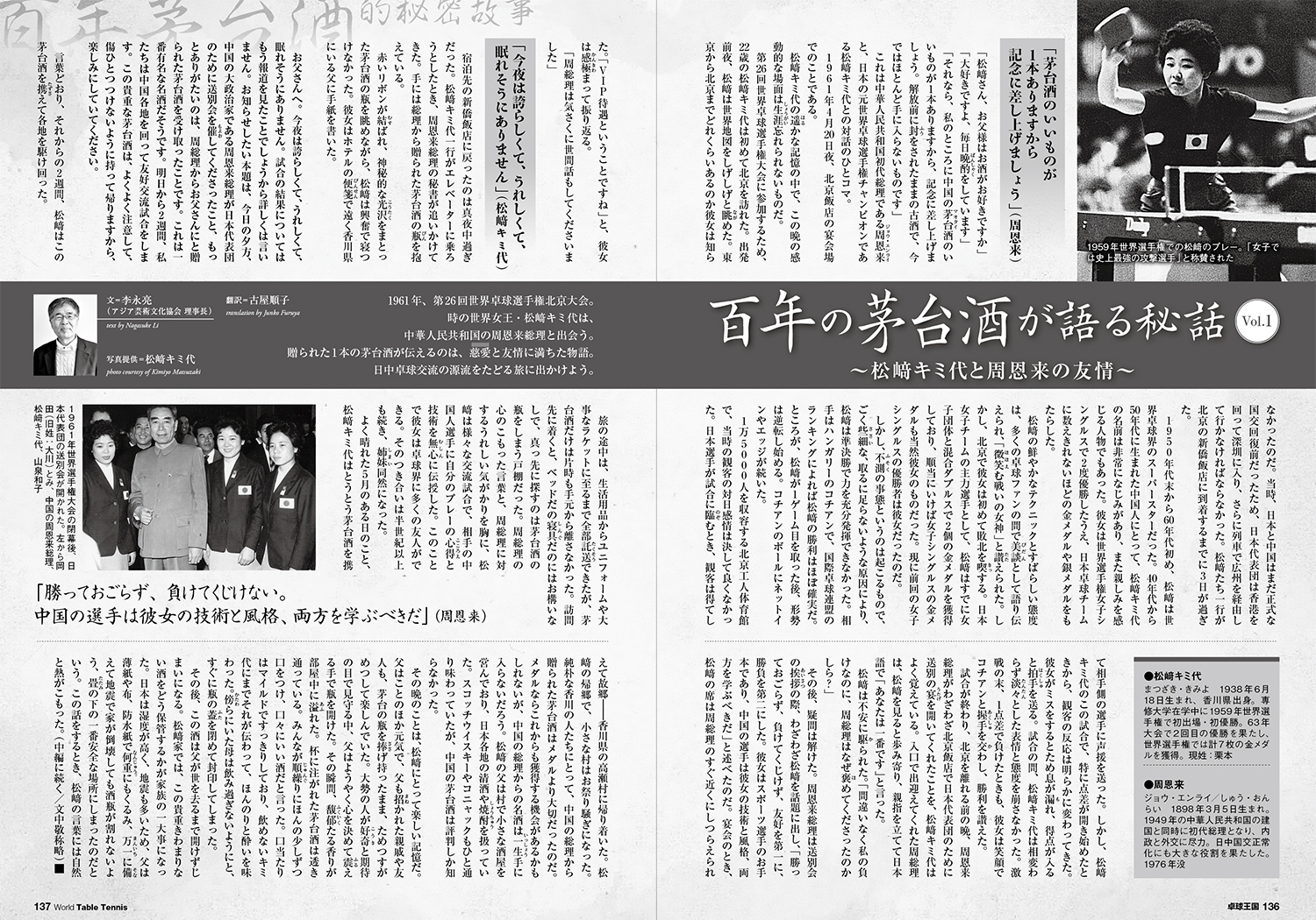 事实也正是这样,在接下来的二个星期里,松崎君代带着这瓶茅台酒走南闯北,一路颠簸。在旅途上,她的生活用品,以至于球衣和心爱的球拍都可以托运,唯独这瓶茅台酒不可以须臾离开自己的身边;到了驻地,什么床铺,什么寝具,她都无所谓,首先要找的是能够安放这瓶茅台酒的小柜子。带着周恩来总理的谆谆嘱托,也带着对周总理的幸福牵挂,松崎君代在各种形式的交流比赛中无私地向中国对手传授了自己的打球心得和技艺,她因此而结交的许多乒坛好友,后来都成了五十多年的世纪朋友,亲如姐妹。