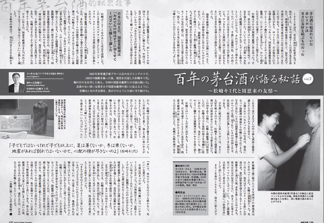 那系在茅台酒上的红色丝巾,正是友谊的纽带,松崎君代和周恩来总理由此开始了长达30多年的交往,在这十多年的岁月里,松崎君代和周总理曾经有过13次的会面,每一次的会面,每一个小小的细节,松崎君代现在回想起来都历历在目,铭记在心,她即使在东京,也时时感受到周总理的如同慈父般的无微不至的关爱。