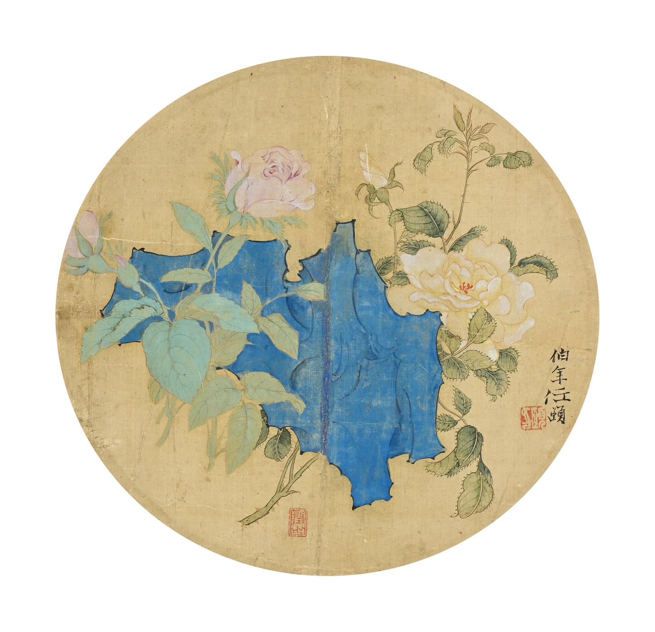 任伯年是海派的代表人物,是“三任”之首,人物、花鸟皆为后人摹写的范本,在美术史上占有重要的地位。任氏扇面尤为精彩,留世不多,此幅团扇刻画精细,花瓣的开合生动可人,花叶的向背翻转自然灵动,赏石坚利秀润,形成了丰富的层次。