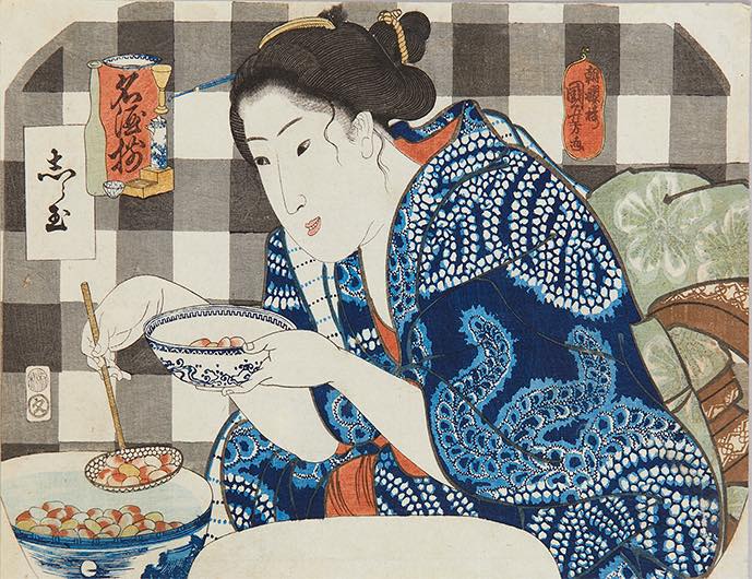 歌川国芳 (うたがわ くによし、寛政9年11月15日(1798年1月1日 ) - 文久元年3月5日(1861年4月14日))は、江戸時代末期の浮世絵師。《東都七福弁天 深川すさき弁天》。団扇にするための「団扇絵」として描かれたもの。桶に積み重ねられた握りずしには楊枝が刺さっている。