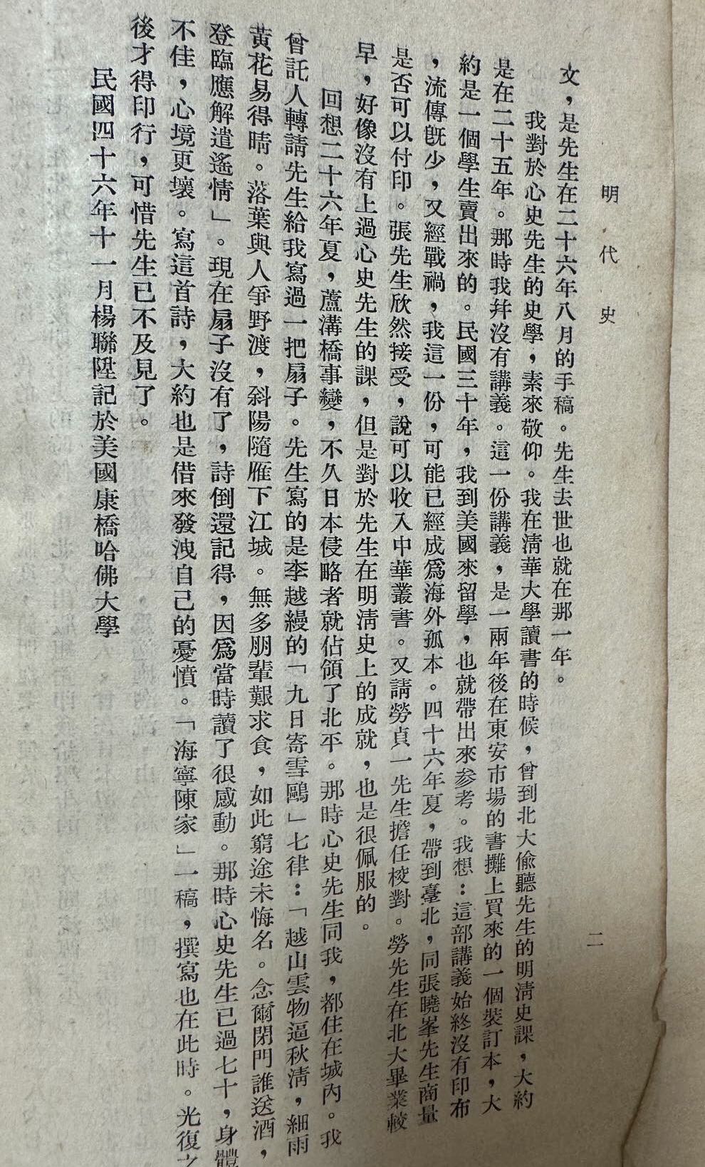 我之所以立即购买下这本史书,是因为该书前面有我外祖父杨联陞“民国四十六年十一月记于美国康桥哈佛大学”的序言,那里面有这样一段话:“回想二十六年夏,卢沟桥事变,不久日本侵略者就占领了北平。那时,心史先生同我,都住在城内。我曾托人请心史先生为我写过一把扇子。先生写的是李越缦的‘九日寄雪鸥’七律:‘越山云物逼清秋,细雨黄花易得情。落叶与人争野渡,斜阳随燕下江城。无多朋辈难求食,如此穷途未悔名。念尔闭门谁送酒,登临应解遣遥情。’现在扇子没有了,诗倒还记得,因为当时读了很感动。那时心史先生已年过七十,身体不佳,心境更坏。写这首诗,大约也是来借机发泄自己的忧愤。”